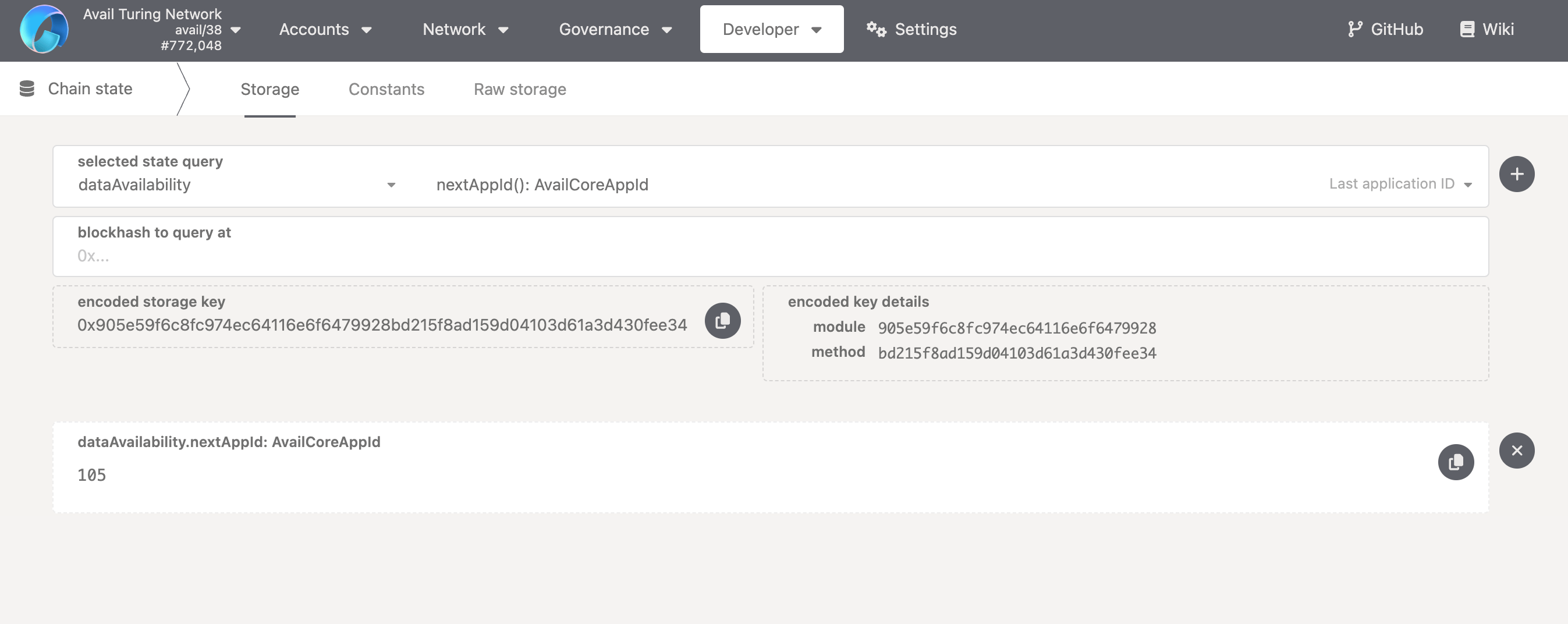 dataAvailabilitypallet, select thenextAppIdmethod. No need to pass any params, just click the+button next to the method name. -