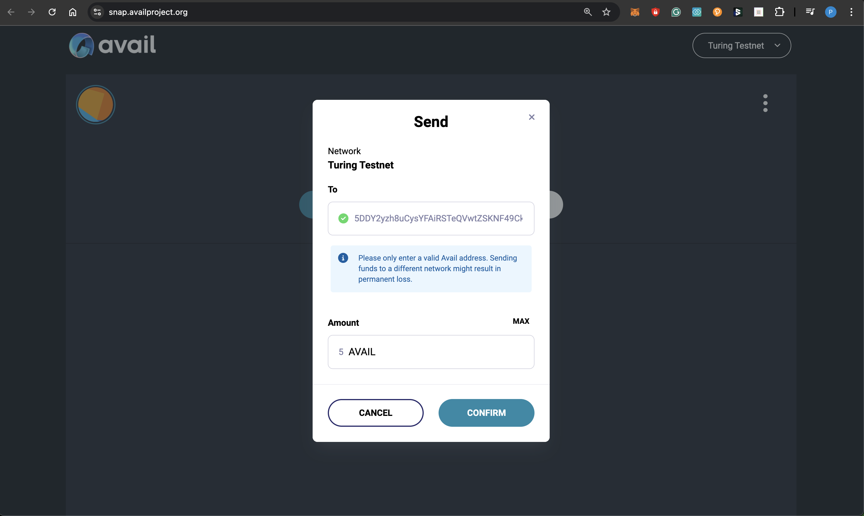 Click on ‘send’ , enter an amount and a recipient, then approve a transaction on Avail DA from within your MetaMask wallet.